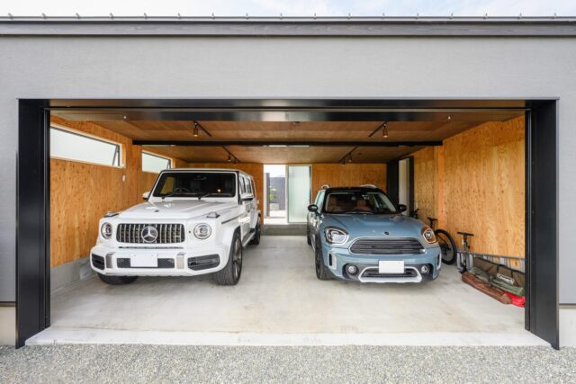 車2台をゆったりと停められるビルトインガレージを備えた、約60坪の大空間住宅が完成しました。