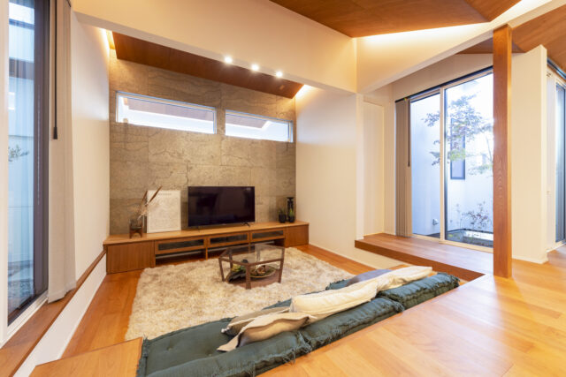 一部、床を下げたピットリビングになっている22畳のLDK。空間に立体感が生まれ、ほどよいこもり感がくつろぎをつくります。