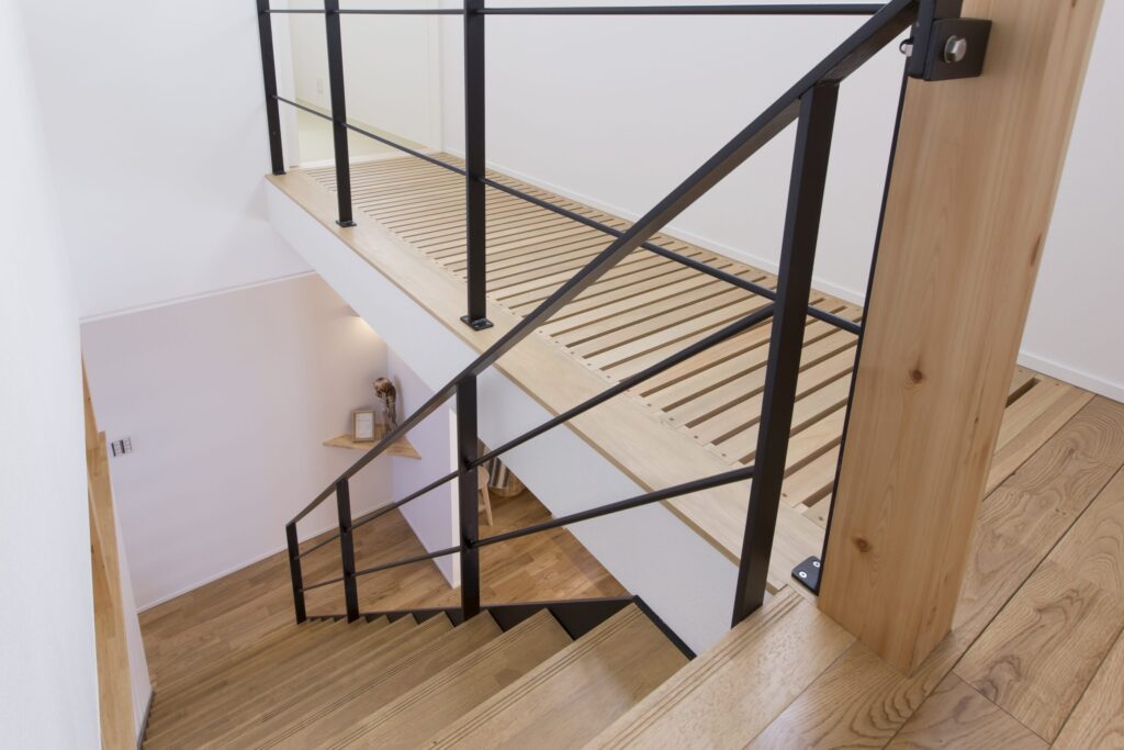 黒のアイアン階段は、洗練されたモダンなデザインで空間に高級感を加えます。