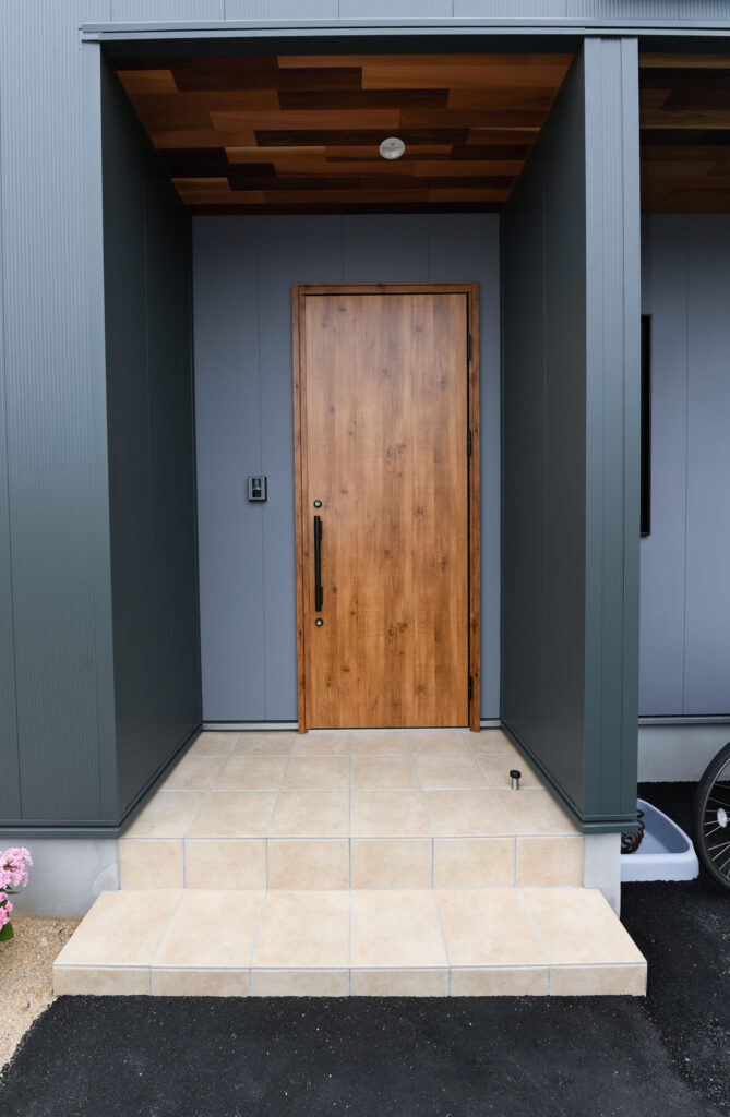 ガルバニウムにナチュラルな木製のドアの組み合わせで調和がとれたデザイン。