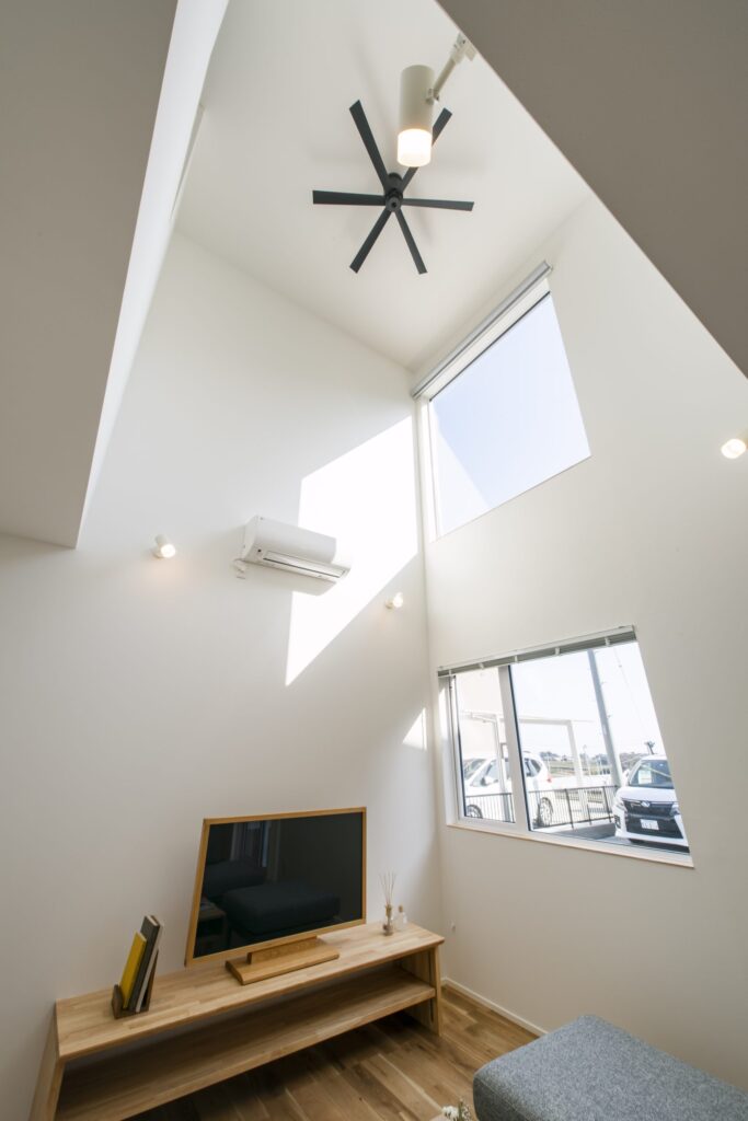 リビングの大きな吹き抜けで自然光がたっぷり入ります。