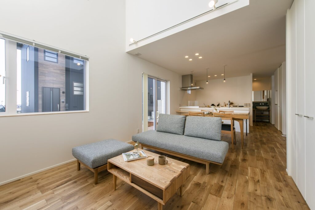 大きな窓と吹き抜けからの光がリビングを明るく照らします。
