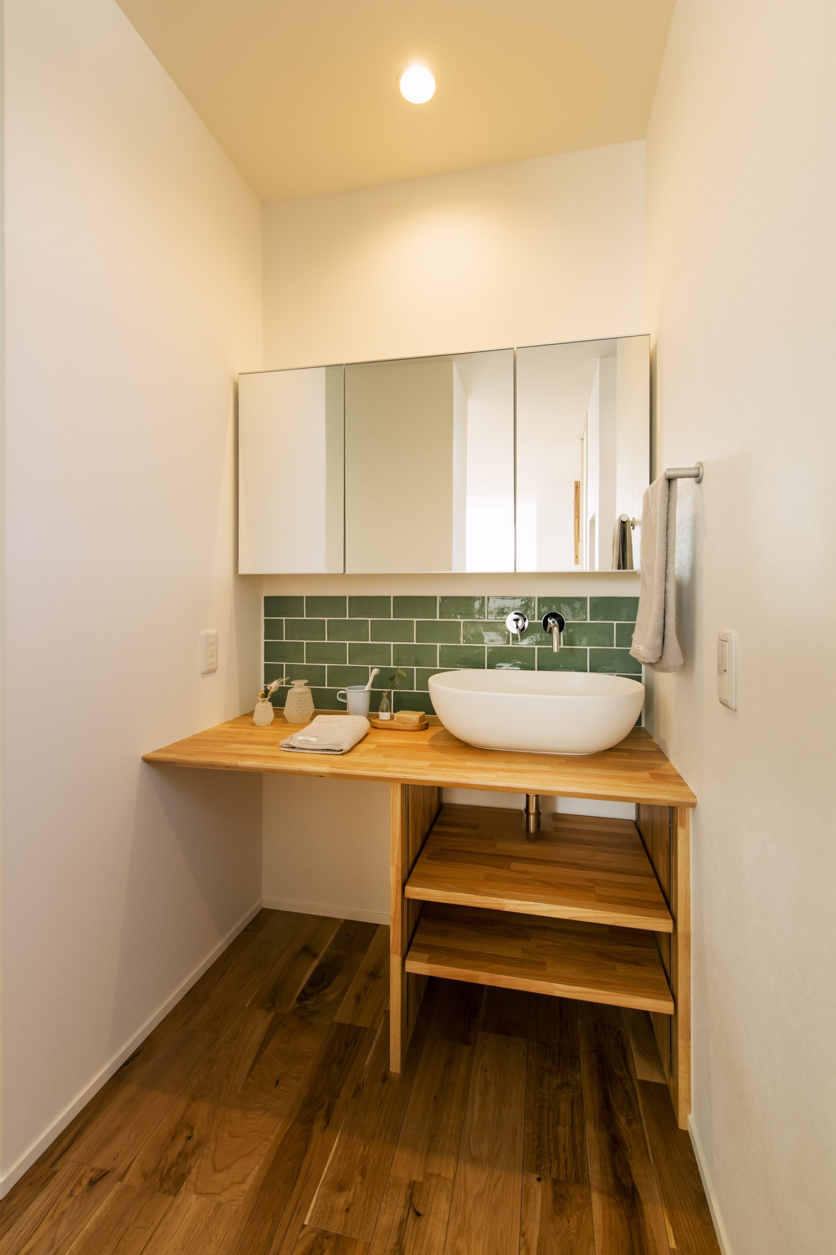 こだわりのタイルで仕上げた造作洗面化粧台が、おしゃれなアクセントとなっています。