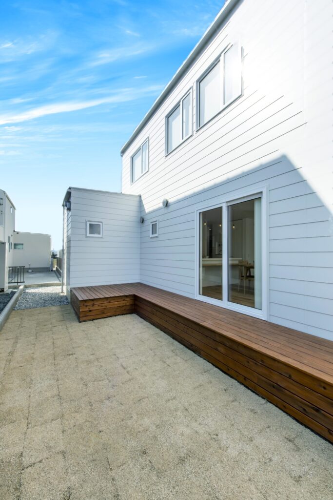 シンプルでシャープな白基調の外観に、玄関周りに板張りのアクセントを施しました。