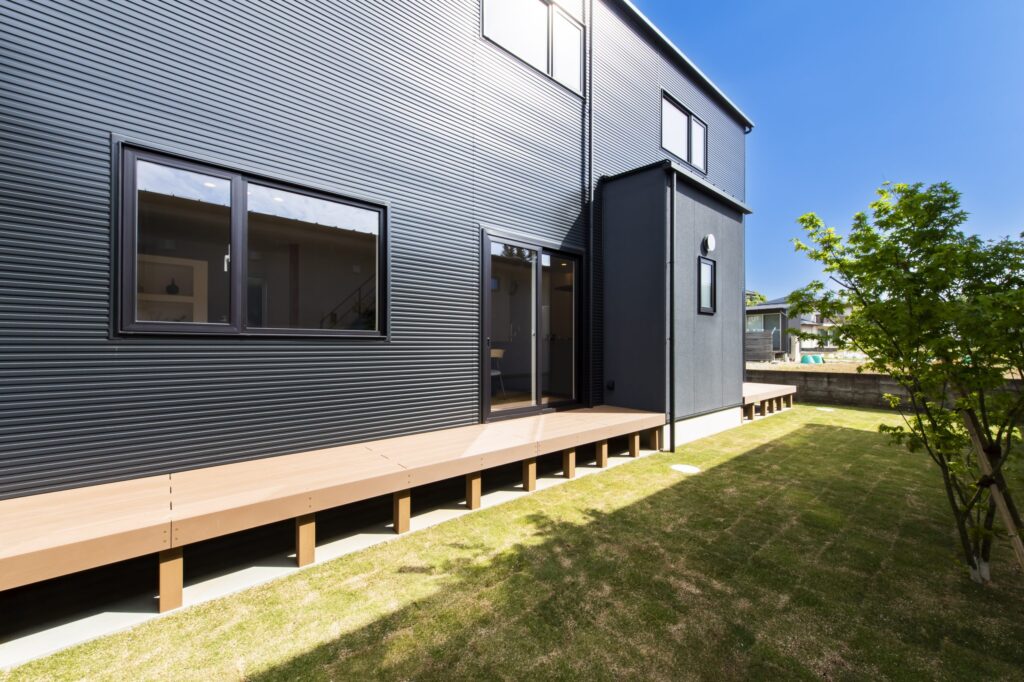 外観はウッドデッキに囲まれており、広々とした庭が特徴です。