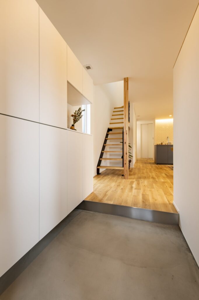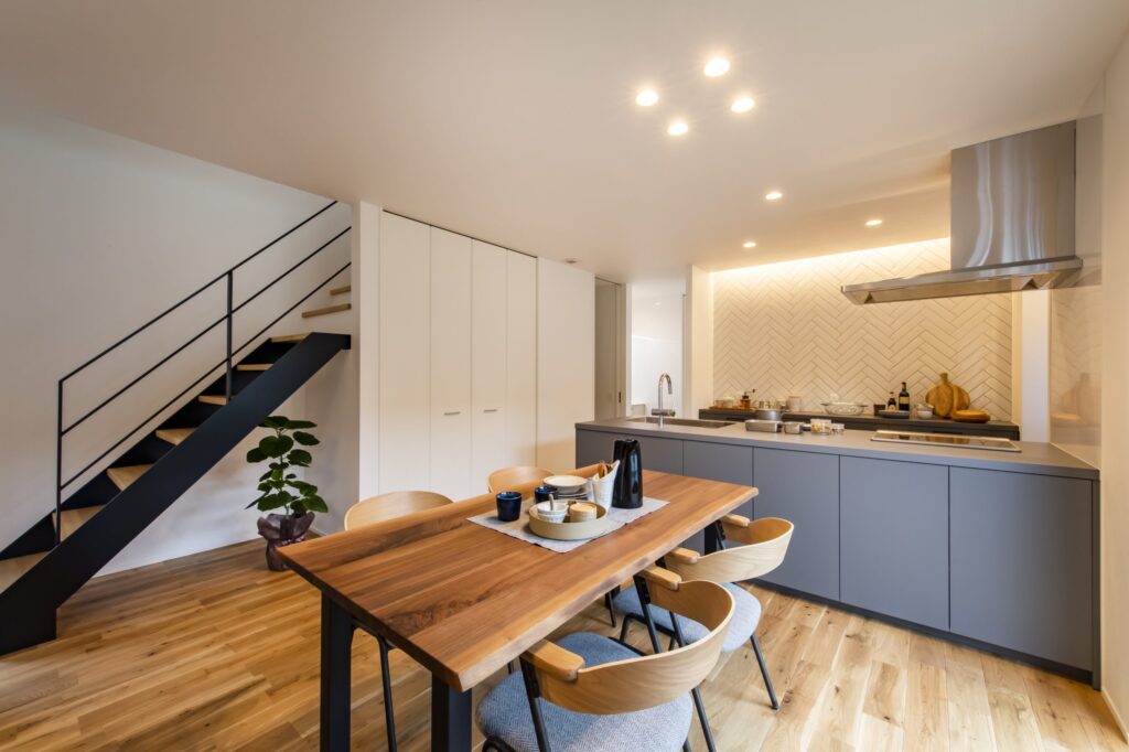 板張りアクセントの大きな玄関ポーチと、プライバシーを確保しながらも風通しを考えた設計。キッチンには間接照明で映える白いタイルが貼られ、冷蔵庫もすっきり収納されてスペースが広い。