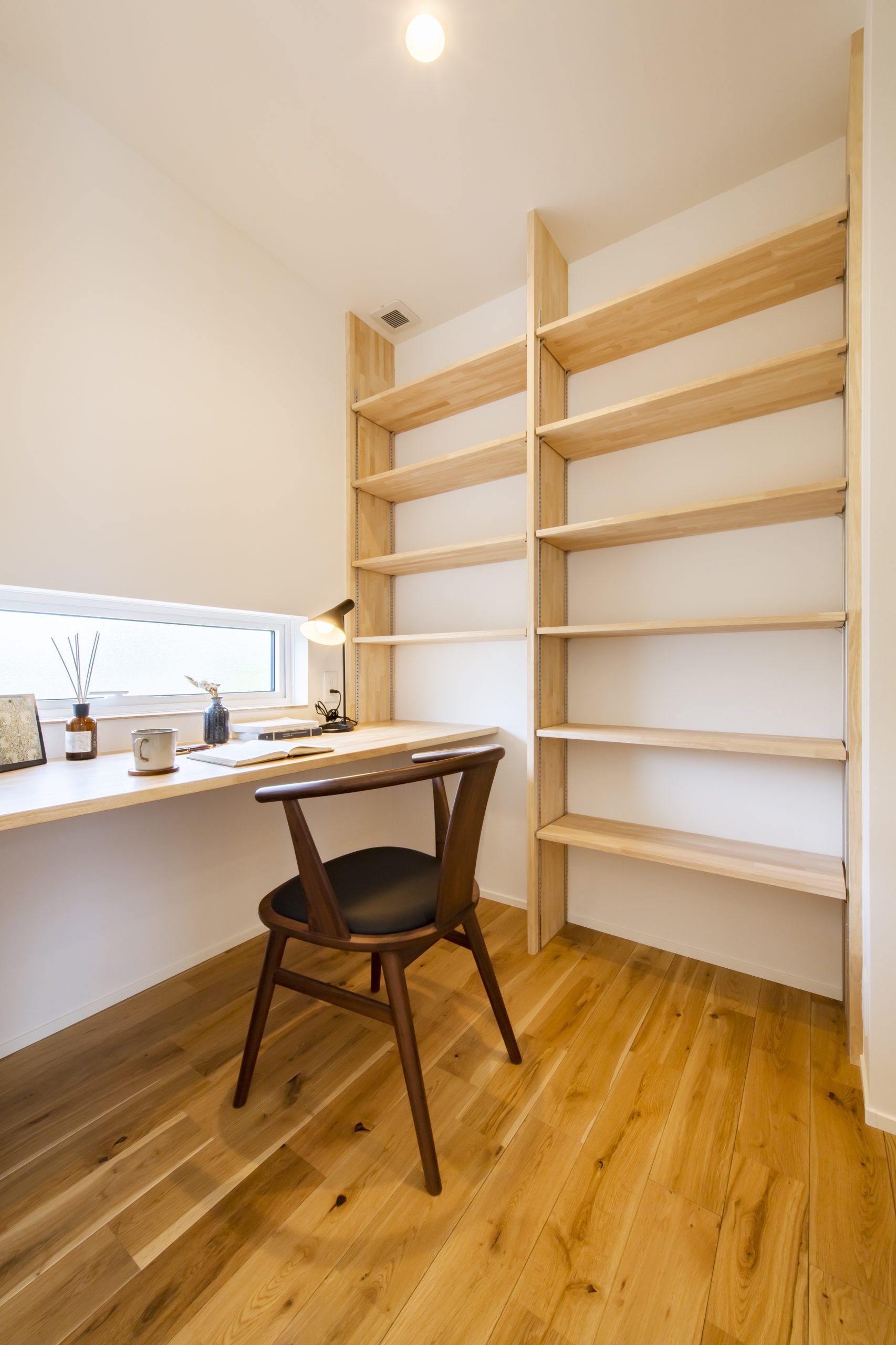 リビングの隣の書斎には大きな本棚があり、2階の主寝室にはたっぷりの日差しとWICが収納も充実し、快適で安心な暮らしの家