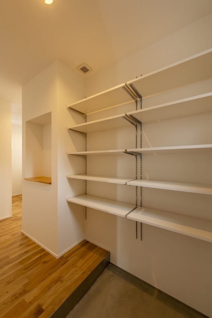 キッチン横に便利な収納スペース。食材から日用品まで、必要なものをすぐ手に取れる設計で、機能性と使いやすさを徹底的に追求した空間です。
