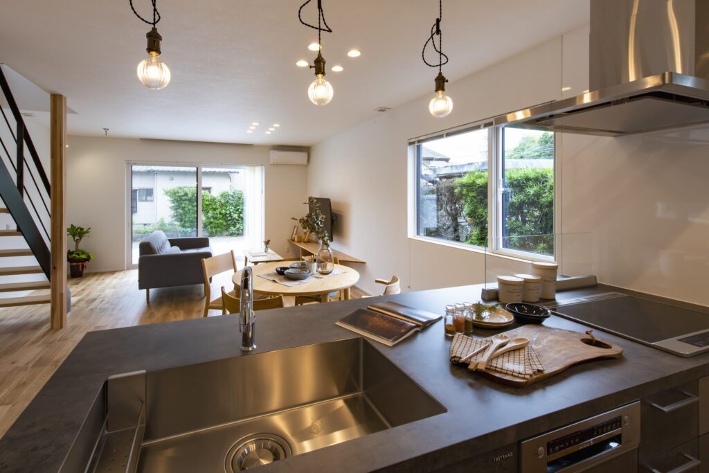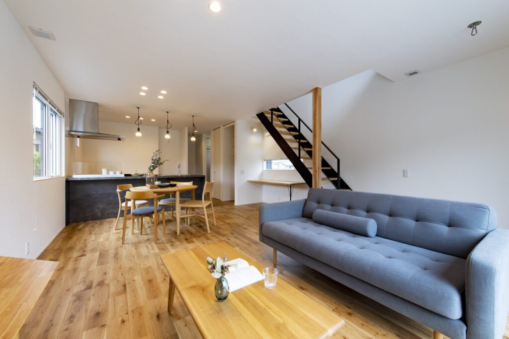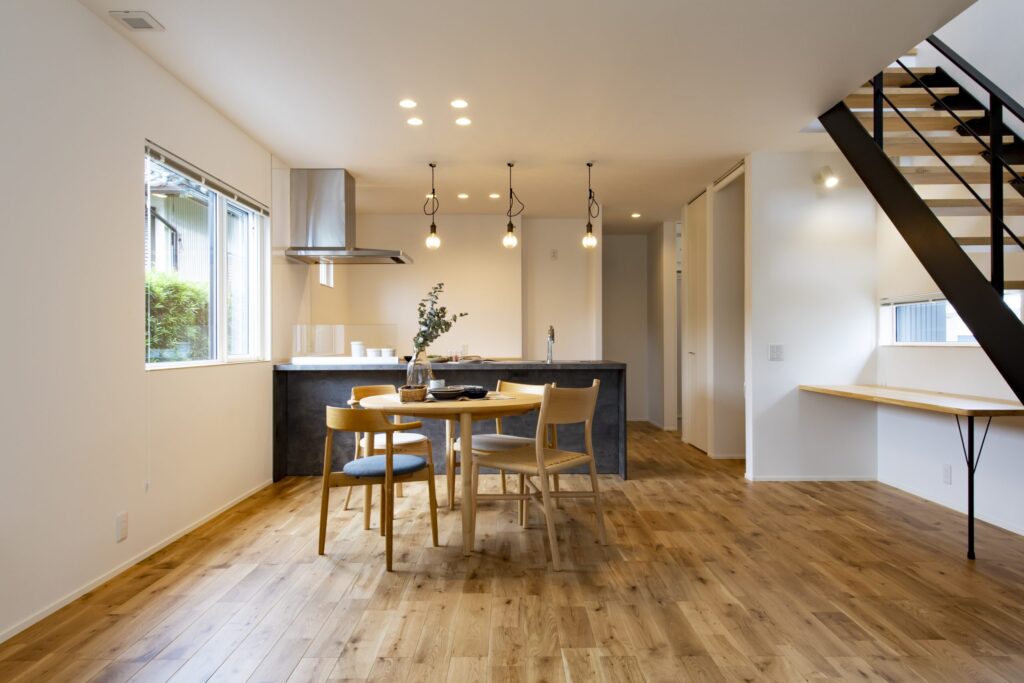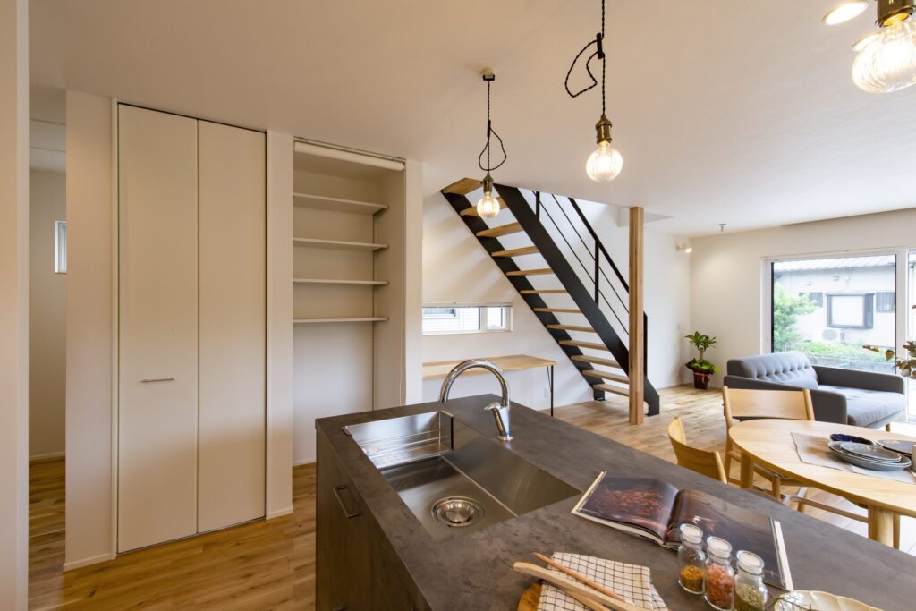 オークの温かみのある床に、グレーのキッチンがモダンなアクセントを加え、アイアン階段が洗練された雰囲気を引き立て落ち着いた美しさを演出しています。