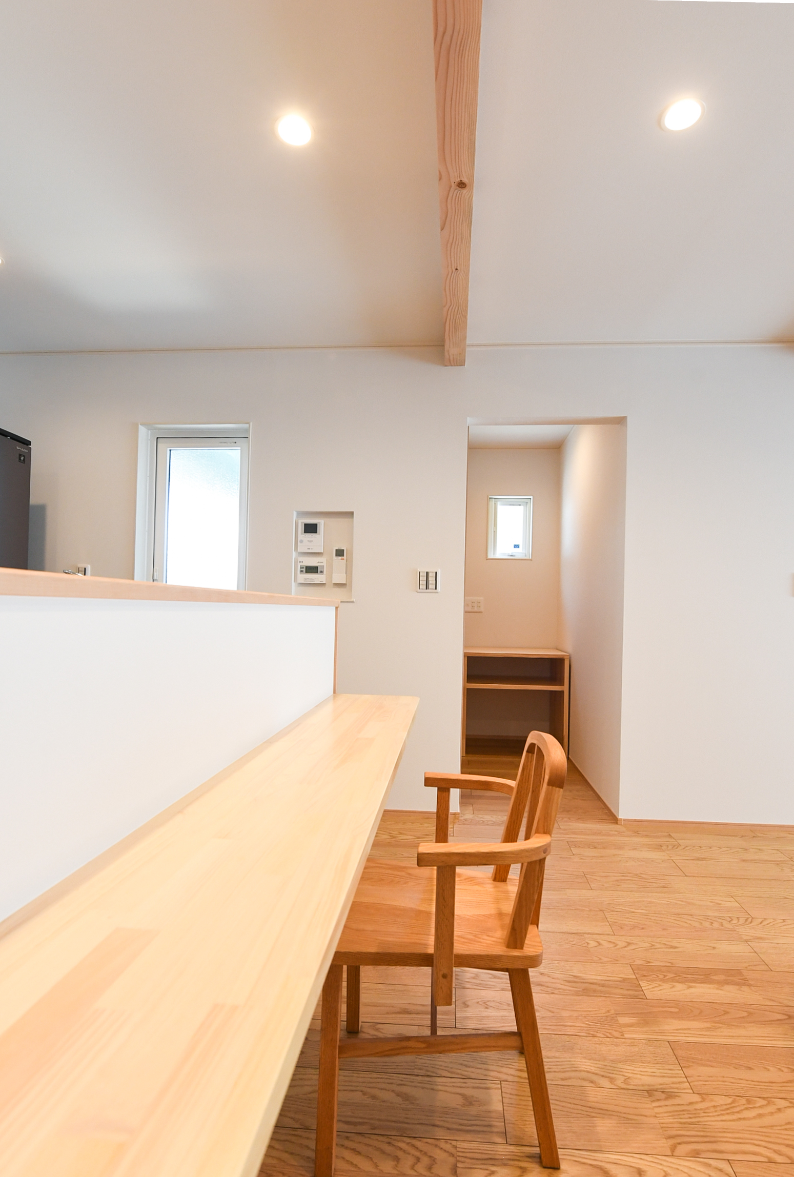 キッチンカウンターはダイニングテーブルの代わりに使え、LDKを広く使う工夫に。来客時にはお洒落なカフェスペースやお子様のリビング学習にも使えます。