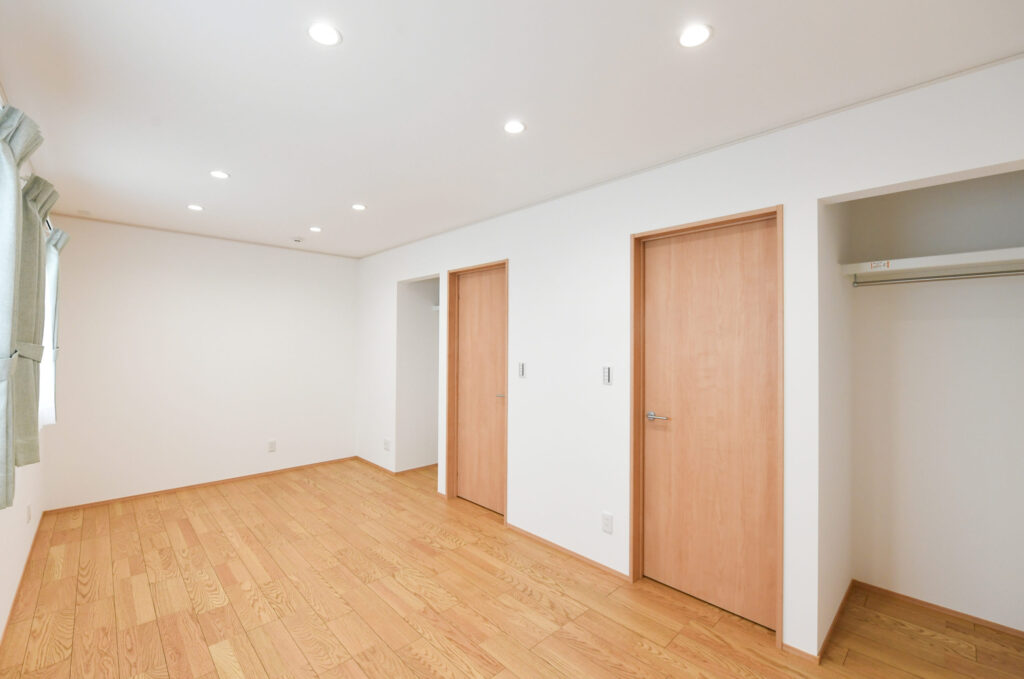 お子様が小さい時は2部屋を一つの広い空間として使用可能。成長に応じて間仕切りで分け、各部屋に【扉・窓・クローゼット】を設けています。